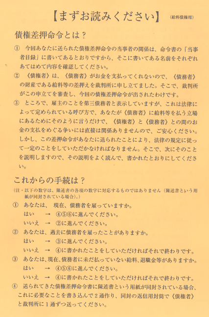 差し押さえ命令には通常、「第三債務者用陳述書」が同封されています。この書類は、会社が第三債務者として以下の情報を裁判所に報告するためのものです。