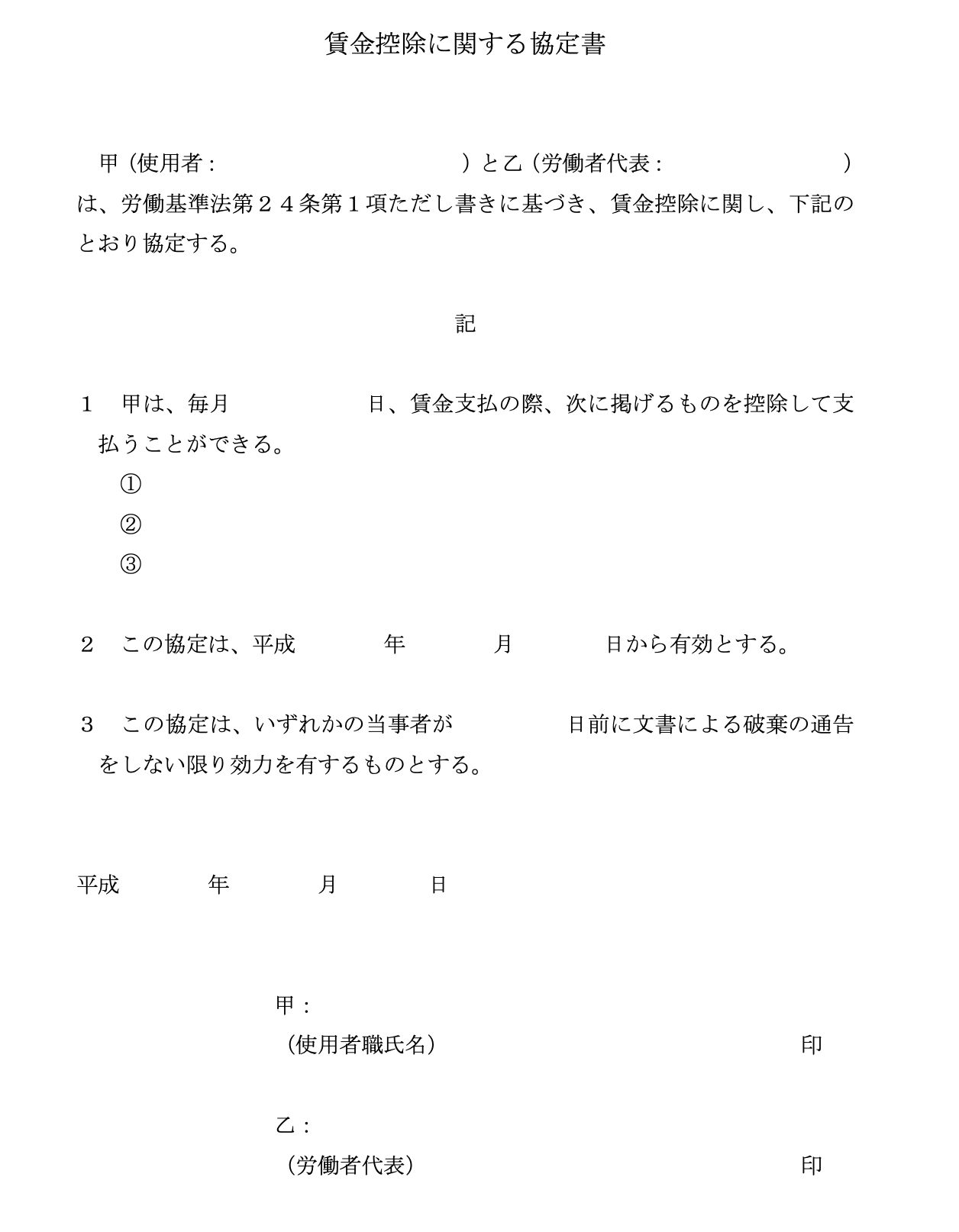 賃金控除を適法に行うためには、「労使協定(賃金控除に関する協定書)」の締結が不可欠です。